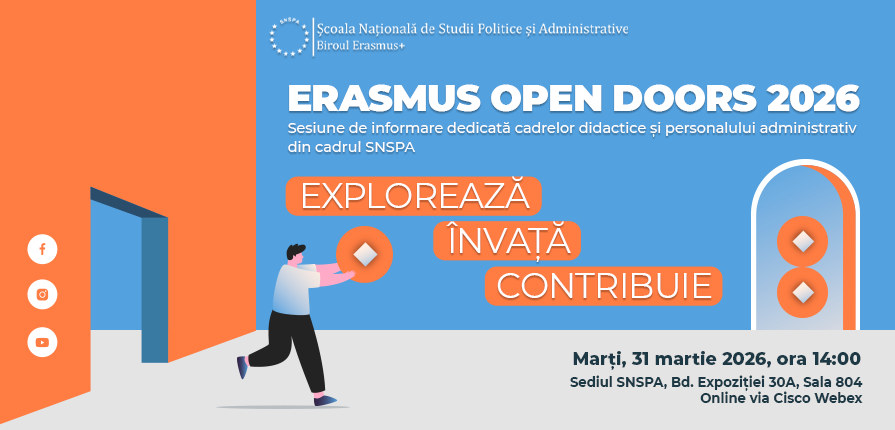Marți, 31 martie 2026, Biroul Erasmus+ din cadrul SNSPA organizează o sesiune de informare Erasmus +, dedicată cadrelor didactice și personalului administrativ din SNSPA.